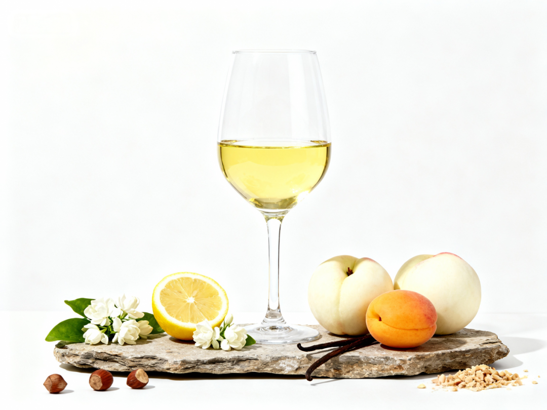 明亮的稻草黄色,散发着白花、清新的柠檬以及成熟的核果(如白桃和杏)的香气,并伴随着精致的香草味道。口感圆润馥郁,展现出矿物质与柑橘类水果的良好层次感,余味中带有淡淡的坚果味道。