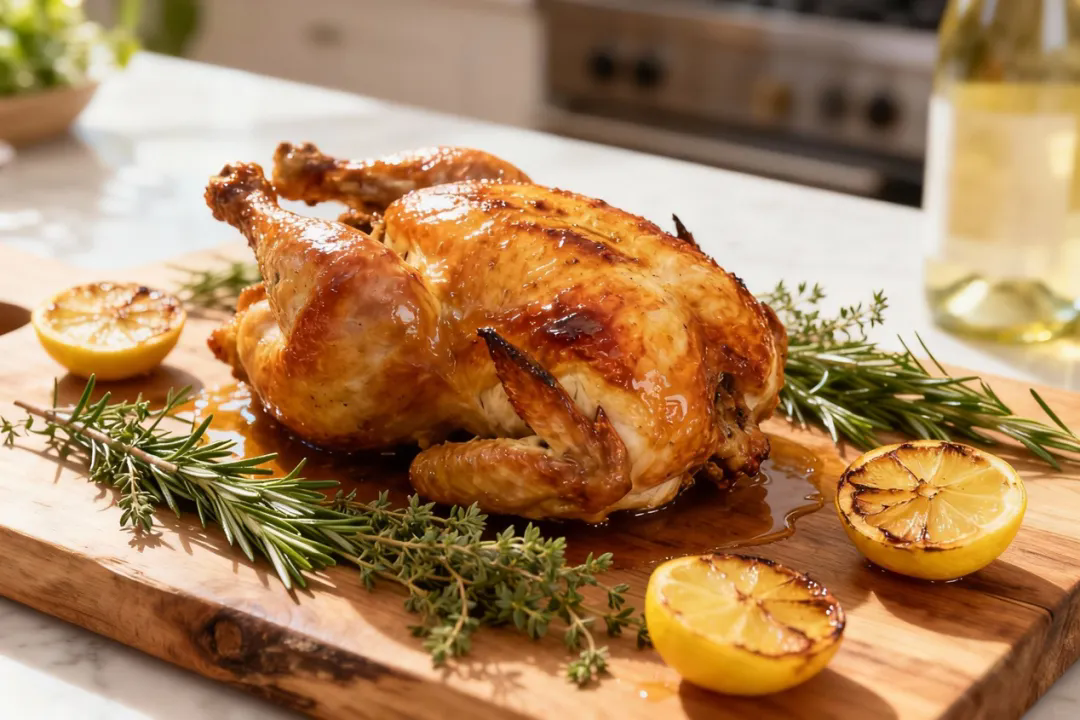 内外抹上橄榄油、盐、黑胡椒、蒜末与新鲜香草(如迷迭香、百里香),塞入柠檬角,静置30分钟。放入预热200°C的烤箱,烤约40-50分钟至表皮金黄、肉质熟透。取出稍放凉,切块后可搭配烤蔬菜或额外柠檬角享用。